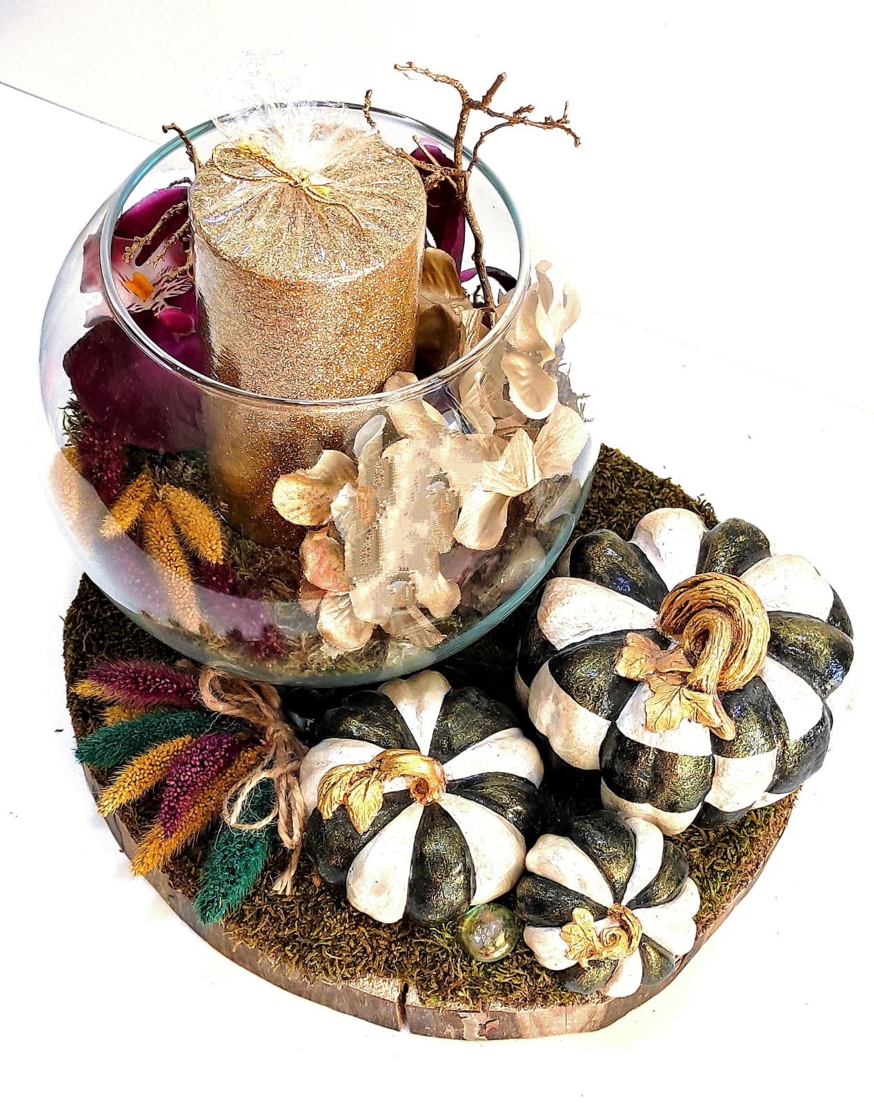 Dekor ,Bakım gerektirmeyen ,kalıcı,Paşabahçe stili cam içerisinde,Büyük Mum,yapay güller,çiçekler,yeteri kadar turba yosunu,kurutulmuş boncuk seterya çiçeği,Çam kabuğu,dışında tarçın demedi,3 adet el yapımı bal kabağı,kozalak,yapay gül,1 dal top çiçeği,1 dal şoklanmış cipso çiçeği,1 adet doğal kütük bulunmaktadır. Tasarım bir dekorasyon olduğu için Mum yakılmak istenirse ayrı bir haznede ,yakıldıktan sonra kontrollü bir şekilde söndürülmeli ve takip edilmelidir.Tekrar yerine konabilir,Kaza riski oluşmaması için Çocuklardan uzak tutmanızı rica ederiz.